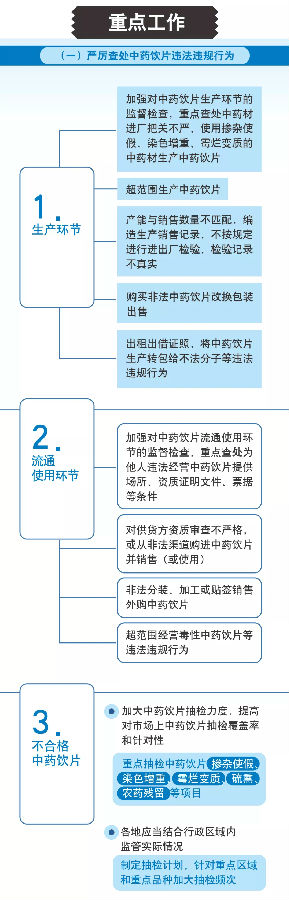 中藥飲片是中藥的重要組成部分,既可以用于中醫臨床配方使用,也可以用于中成藥生產,其質量關乎人民群眾用藥安全有效。近年來,各級藥品監管部門持續加大對中藥飲片監督檢查和抽檢力度,依法查處和曝光違法違規企業和不合格產品,中藥飲片總體質量狀況有所好轉,但存在的問題仍不容樂觀。為進一步加強中藥飲片監督管理,提高中藥飲片質量,國家藥品監督管理局決定在全國范圍內開展為期一年的中藥飲片質量集中整治。